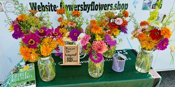 Comes with 12 zinnias, 5 cosmos, 2 sunflowers, baby’s breath, and greenery, mason jar